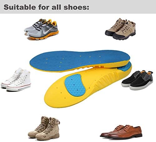 【EXCELLENT CUSHION & SHOCK ABSORPTION】This memory foam insoles were made of soft & springy & ultralight memory foam material, providing excellent cushioning and shock absorption, these comfortable shoes insoles make your feet feel like walking on clouds. Relive pain of flat foot, plantar fasciitis and other feet problem, great for standing in place or standing/walking all day, jogging, running, basketball, climbing, other sport and casual use