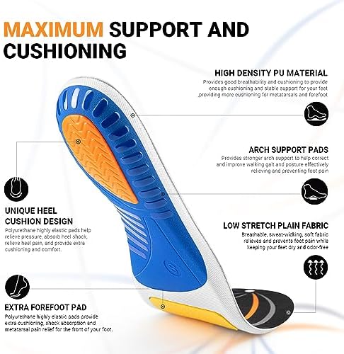 【Arch Support】: Upgraded Semi Rigid High Arch Support Insole With Arch Support And Deep U-Shaped Heel Cup, Which Can Correctly Position The Foot, Provide Stability, Help Adjust The Whole Body, Reduce Foot Pressure, And Provide Uniform Load Distribution For The Foot. Additional Pu Front And Rear Pads Can Also Prevent And Alleviate Pain And Discomfort Related To Metatarsals And Metatarsals, Heel Or Arch Pain And Discomfort, Excessive Pronation Supine And Foot Pain/Soreness Related Pain.